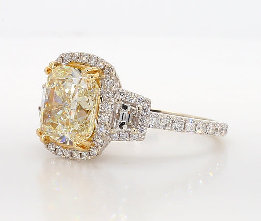 Fancy Light Yellow Cushion 3 stone Diamond Ring 5.05 Carat