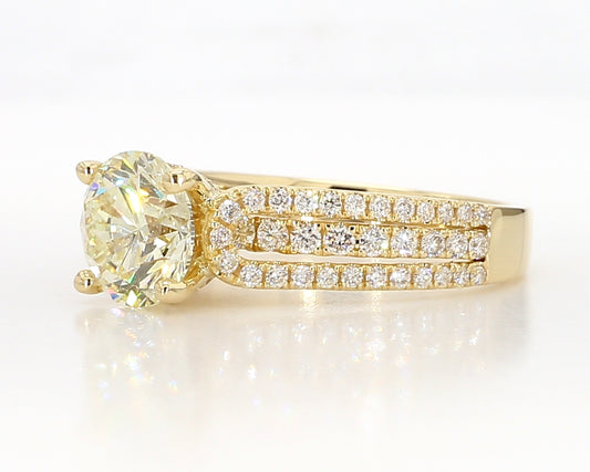 Regular price $7,999.00Regular priceUnit price / perSale price $7,999.00Round Brilliant cut Ring expertly crafted in 18k Yellow Gold. The center stone weighing 1.89 carats and features a beautiful S color with I1 clarity. This piece is elegantly complemented by 0.59 carats of Round Brilliant cut side stones. Perfect for special occasions and a timeless addition to any collection.